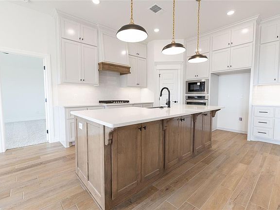 The Hazel Half Bath Plus floor plan has 2,225 Sqft of total living space, including 225 Sqft of outdoor living and 2,000 Sqft of indoor living. This home offers 4 bedrooms, 2 full bathrooms, 2 covered patios, a powder room, a utility room, and a 3 car garage with an in-ground storm shelter installed. The living area presents a nice corner fireplace with our stacked stone surround detail, a luxurious coffered ceiling with a ceiling fan, large windows, rocker switches throughout, a barn door, and wood-look tile. The up-scale kitchen welcomes a large island with a trash can pullout installed, 3 CM countertops, elegant pendant lighting, decorative tile backsplash, custom-built cabinets to the ceiling, soft close drawer glides and hinges, stainless steel appliances including a 5-burner cooktop, and a corner pantry. The primary suite spotlights a sloped ceiling detail with a ceiling fan, windows, and our cozy carpet finish. The primary bath offers a dual sink vanity, a large walk-in shower, a free-standing tub, a private water closet, and a HUGE walk-in closet. Outdoor living features a wood-burning fireplace, a gas line, and a TV hook-up. This home also features a tankless water heater, an air filtration system, R-44 insulation, and so much more!
