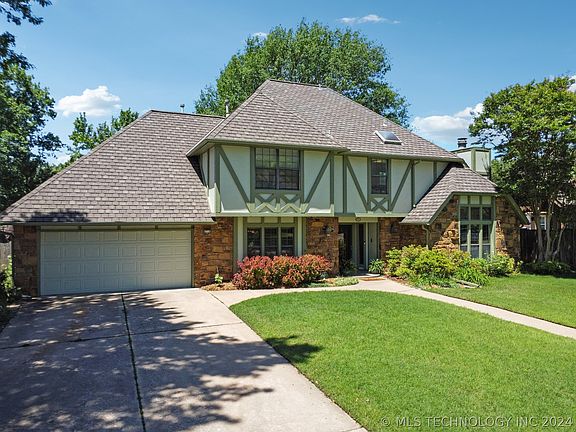 Lush gardens surround this Lovely English Two Story on the market for the first time in 30 years! Come discover desirable Chimney Hills Estates in S. Tulsa near 91st & Sheridan. This 4 Bed/2.5 Bath/2 Car has been lovingly maintained and updated. Step through the charming front door with stained glass to the gracious entry and staircase. Enormous vaulted Great Room spans the depth of the home with windows on each end and includes a massive stone fireplace and luxury wood paneling. The tastefully remodeled kitchen has granite countertops & gorgeous backsplash, plus a cooktop island with modern vent hood. Primary bath has been freshly updated with new tile, paint & fixtures. All new carpet upstairs and several freshly painted rooms. Formal, separate dining room could be office space. Extra large backyard has full privacy fence and absolutely amazing landscaping, mostly perennial, to enjoy lovely plantings year round. Come see this lush, green goddess property with unforgettable charm and character.