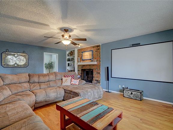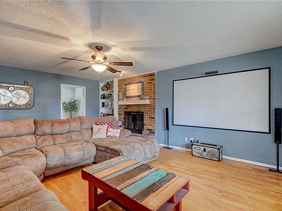 This beautiful home features a large living room with a brick fireplace and a projector screen. The kitchen includes stainless steel appliances, a breakfast bar, a tile backsplash, and a separate bar area. The master suite offers a private en suite with double vanities with granite countertops and an additional storage closet. This home includes a large backyard with tall trees and lots of room for entertaining!