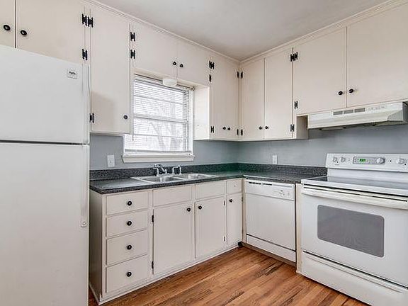 Charming two bedroom, one bath duplex just a mile from Overland Park. Each bedroom has a wall of floor to ceiling cabinets for ample storage. Updated throughout with hardwood floors, and new tub/shower, counter tops, sink and dishwasher. Refrigerator and stove included. One car garage and Washer/Dryer Hookups. One pet is okay with certain breed restrictions and additional deposit. Please apply through Zillow. Rental contracts are for a minimum of one year, but will consider shorter term lease for the right conditions. Tenant responsible for all utilities and maintenance. Tenant responsible for all utilities and yard maintenance.