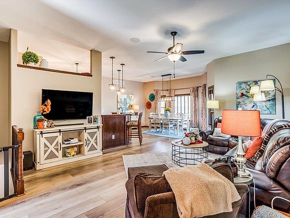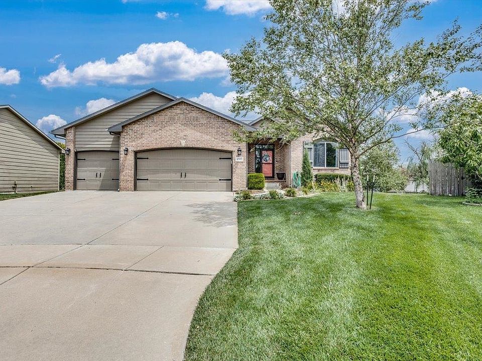 Welcome to this stunning home in the Maize South School District, offering beautiful water views and gorgeous curb appeal with a partial brick facade, well-manicured landscaping, and lush green grass, effortlessly maintained by the sprinkler system. A three car garage provides ample parking space. Step inside to a vaulted entry foyer and admire the beautiful new luxury vinyl flooring throughout the main floor, installed just a year ago. The living room is open to the dining room, giving you an excellent layout for entertaining. The dining room features windows that overlook the lovely back yard and a door that leads to the back deck. In the well-appointed kitchen, you'll find an eating bar peninsula, abundant cabinet and counter space, and a pantry, making it easy to cook a small meal or even a holiday feast. The spacious master suite offers a spa-like en suite bath with a walk-in tiled shower featuring dual shower heads, a double vanity, and a huge walk-in closet. Two additional bedrooms, a second bath, and a conveniently located laundry room complete the main floor. The walk-out basement provides even more living space, featuring a living and recreation room with a cozy fireplace, wet bar, and a back door leading out to the patio, perfect for hosting game nights with family or friends. A neat little nook near the wet bar can be used as a kids' play space, a spot for your pet, or even extra storage. The basement also includes a fourth bedroom and third bath, ideal for a second master or guest's quarters. An unfinished fifth bedroom offers even more space to spread out and expand. Out back, the 15x12 covered deck provides a seating space you can enjoy year-round and a great patio area that's perfect for summer barbecues. In addition, the beautiful community features a lake with a waterfall, ideal for taking lovely strolls during the warmer months, along with a community pool and playground. This home is tucked away on a quiet cul-de-sac but is close to Maize South Schools, parks, and is just a short drive to shopping and restaurants in NewMarket Square. Schedule your private showing today and come see this gem quickly before it's gone!