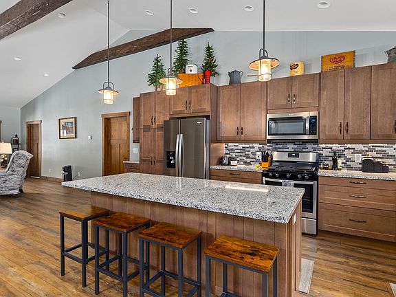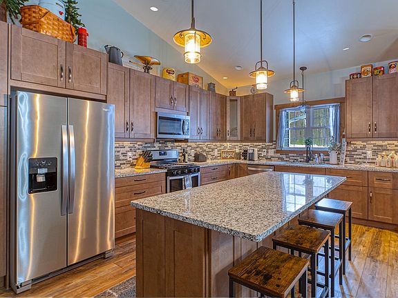 This beautifully designed home is the perfect blend of contemporary comfort and rustic elegance. The kitchen features granite countertops and a stylish tile backsplash, creating both a functional and visually appealing space. The great room boasts impressive exposed timbers, enhancing the inviting atmosphere, while the stone fireplace adds a cozy touch, perfect for gatherings on cool evenings. Enjoy year-round enjoyment in the 4-season sun porch, a versatile space offering natural light and a connection to the outdoors, no matter the season. Outside, the stamped concrete patio provides a sleek and durable space for outdoor entertaining or simply relaxing in the fresh air. Built for energy efficiency, this home is plumbed for a mini-split system (not yet installed) and is fully insulated with closed-cell spray foam insulation, ensuring consistent comfort year-round. With its unique combination of features, this home provides both modern conveniences and classic charm.