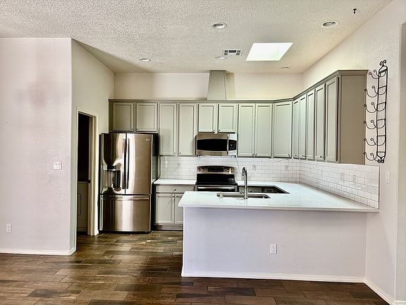 Beautiful Modern 3 bedroom 2 bathroom townhome near Ladera and Unser NW! This 8-year old home feels brand new and offers all the modern touches with Build Green Silver Certified energy efficient refrigerated AC and furnace for low utility costs. Elegant open floor plan with raised ceilings throughout and skylights. Great room offers living area, dining area, and kitchen with Silestone Quartz Counters, undermount deep basin sink, ample hardwood cabinets, French Door Stainless Steel refrigerator, double oven, and breakfast bar. Ceramic tile looks like hardwood, with carpets in bedrooms. Modern fixtures throughout with ceiling fans in all bedrooms. Custom tile showers in both bathrooms, double master sinks, ample bathroom linen storage. Lush backyard with grass and flowering bushes and storage shed. 2-Car garage with slop sink and cabinets and shelves for extra storage space. Appliances included: washer, dryer, refrigerator, stove, dishwasher, microwave.