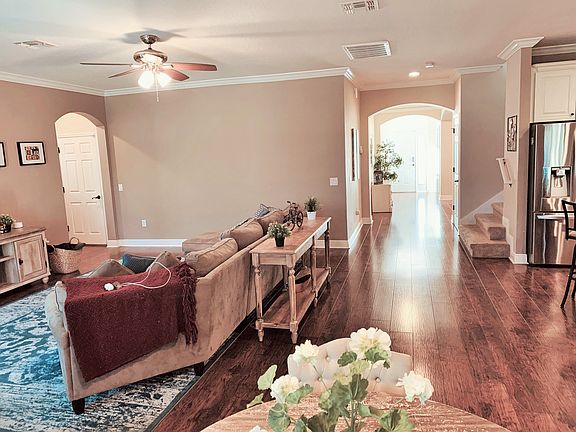 - Interior Features: Ceiling Fans(s), High Ceiling(s), Crown Molding, Walk-In Closet(s), Window Treatments, Open Floorplan, Solid Surface Counters, Eating Space In Kitchen, Kitchen/Family Room Combo, Tray Ceiling(s), In Wall Pest System, Thermostat