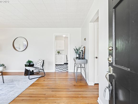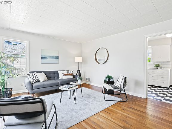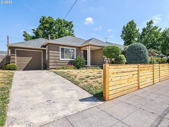 Charming one level bungalow in desirable Montavilla! Conveniently located close to parks, I-205, Mall 205, coffee, local cafes and food carts. Enter the property through a new fence/gate, up to the porch and into the living room that features hardwood floors. The kitchen has new flooring and tile backsplash and plenty of room for a breakfast nook. There is access from the kitchen into the one car garage that also houses the laundry hook-ups and gives access to the spacious backyard. Two bedrooms, both with hardwood floors are separated by a full bath with glass enclosed shower. Fully fenced and level backyard with gardens. Plenty of space here to allow your creativity to flourish. 97 Biker's paradise!