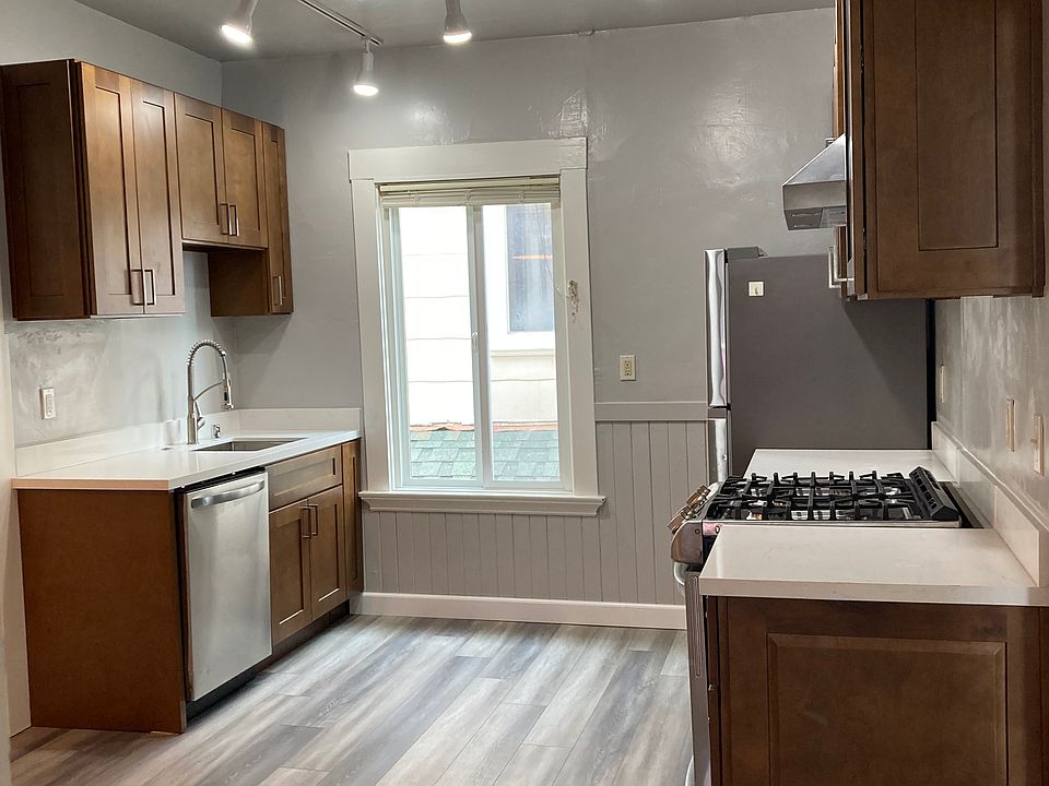 North Oakland, Berkeley Emeryville Border (NOBE) neighborhood. Completely renovated 3 br and 1.25 ba, 1,057 sq ft UPPER unit of a sunny and airy duplex. Located on the safe and quiet, tree-lined residential 58th Street between Adeline Street and Martin Luther King Junior Way. The three bedrooms each have large windows and a closet. There is a full bathroom with bathtub, and an additional small bathroom with a toilet next to the in-house front-loading washer and dryer. The kitchen, bathrooms, appliances, paint and flooring are newly renovated. The tasteful renovation includes, quartz countertops, a dishwasher, a garbage disposal, carpets and window blinds. One-year lease, Monthly rent - $3,150, Deposit - $3,150. Owner pays for garbage, sewer, and water. Tenants pay for gas and electricity. There is always plenty of street parking outside. Cats with deposit, no dogs. Renter's insurance recommended but not required.