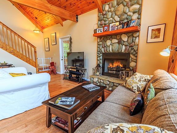 Highly Desirable Location Less Than 3 Miles to Town, Amazing Year Around Mountain Views. Cathedral Wood Ceilings, Exposed Wooden Beams, Wall of Windows Capturing the Year Around Mountain Views, River Stone Fireplace, Hardwood/Tile Flooring throughout. Large Kitchen, Granite Countertops, Master Suite w/Walk in Closet & Laundry on Main Level, Sunroom/Additional Dinning Room. 2 Spacious Bedrooms Upstairs with Shared Full Bath and Loft. Full Finished Basement with Living Room, Bedroom, Full Bath, Work Out/Bonus Room with Private Gentle Patio. 1 Car Garage/Workshop. Large Patio Deck Below which would was previously used for Above Ground Pool.