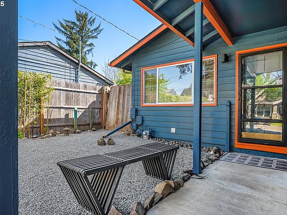 FIT CHECK! This charming bungalow is all dressed up and ready to go. Situated on a quiet cul-de-sac just steps from Kenton Park, the bold blue and vibrant orange exterior color combo piques your interest and never lets up. A calming rock-n-rain garden in the front yard is the perfect setting for morning coffee and/or evening cocktails. Step inside to open concept living and dining spaces along with a surprisingly spacious kitchen and attached garage access. Sliding doors off the dining area lead you to a covered patio allowing for year-round al fresco gatherings. The large, newly-fully-fenced backyard includes a firepit and plenty of room for sunny gardening opportunities and puppy play dates. Back inside, three good-sized bedrooms await; giving you options for a primary bedroom, guest/housemate/mini-me room, and/or a home office. If you haven't yet discovered the under-the-radar Kenton neighborhood, you're in for a real treat. It's the definition of walkable. Coffee, restaurants, shopping. Even a library! Lots of biking, commuting, and transit options too. Come and check out 8722 during one of our weekend open houses and then walk over to the Kenton Business District to discover and support the local community! [Home Energy Score = 10. HES Report at https://rpt.greenbuildingregistry.com/hes/OR10237490]