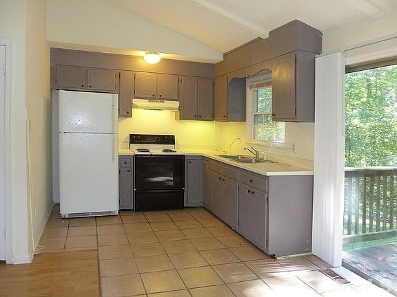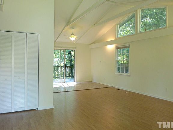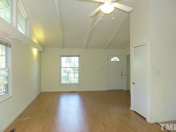 Main level of duplex, minutes to Carrboro, Chapel Hill. Livng room with vaulted ceiling, exposed beams, hardwood style laminate flooring. Living room, dining area and kitchen all open. Dining area includes a ceiling fan. Kitchen includes appliances. All 3 bedrooms have hardwood style flooring. Master bedroom has 2 closets and a private bathroom. Raised deck, fenced backyard. Front/backyard shared with other side of duplex. Pet w/fee & approval.
