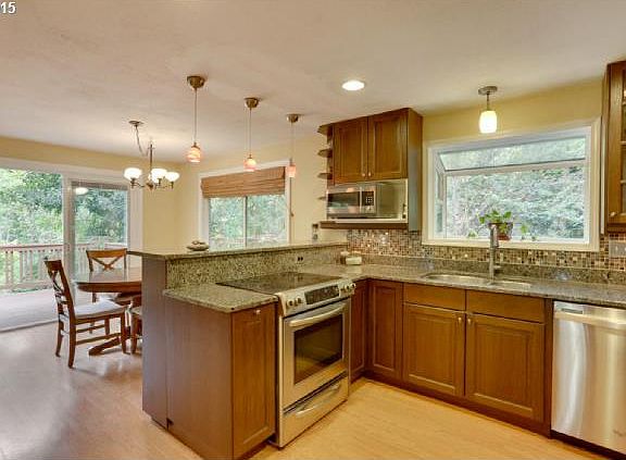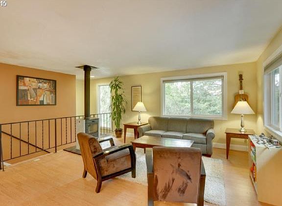 This unique style home is set in the trees with lots of privacy and is open & bright inside w/ lots of big windows. It features an updated kitchen & bathrooms, new windows, large master, Swedish wood stove with soap stone, and great downstairs w/ many options. The big private deck off the living room is great for entertaining. It also leads down to another private outside living area to lounge in comfortably.