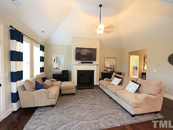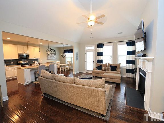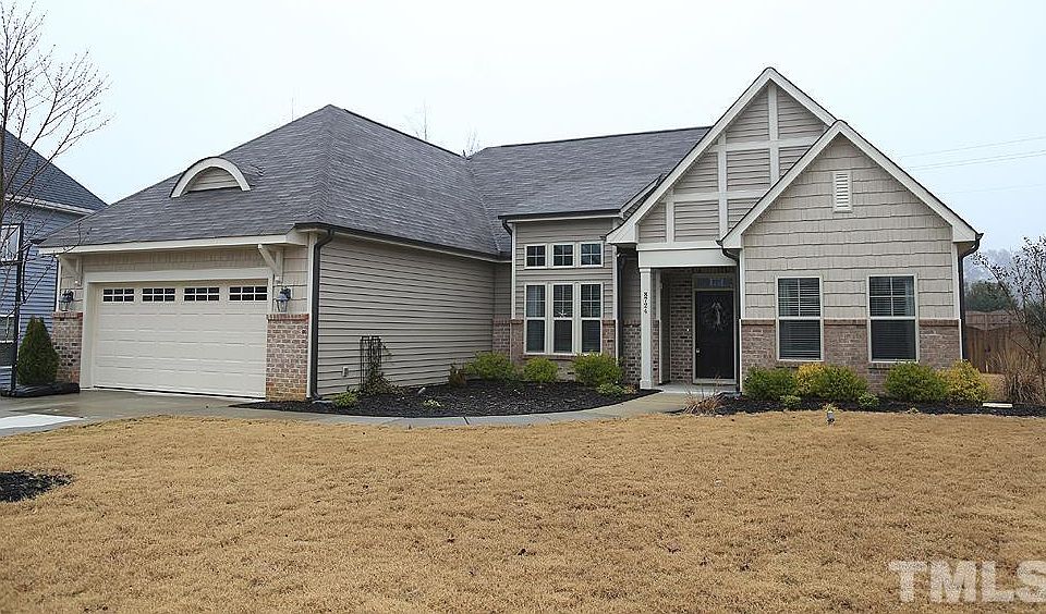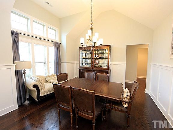 Almost NEW RANCH with FENCED backyard in WAKE county! Raised, vaulted and tray ceilings throughout. Oversized kitchen island with white cabinets, granite tops, and stainless appliances. Large breakfast room and separate formal dining with craftsman trim and raised ceiling. Laundry room offers direct access to Owner's suite as well as mud room complete with drop zone. Split bedroom plan with great closet space throughout Hardwood through living areas, carpeted bedrooms, tile baths.