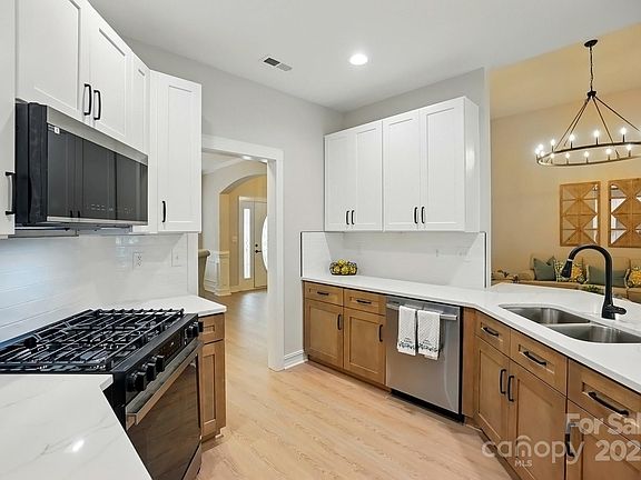 Price adjusted! Motivated seller. Ideally located minutes to Matthews, I-485, & Mint Hill. Renovated ranch w/soaring ceilings, an air of elegance & elevated design! Deep wrap front porch. Luxury VP w/new carpet in bedrooms! New cabinets & high end, low maintenance quartz counters, & custom coffee bar. Bespoke Samsung appliance package including gas range/oven. Designer light fixtures! Formal dining w/millwork. Great room w/gas logs & lots of natural light. Primary w/sitting room & updated ensuite bath w/gorgeous new tiled shower, & garden tub. Walk in closet. Laundry room/drop zone off garage is massive. Pre-plumbed for utility sink hookup or could become a doggie shower. Split bedroom plan. Light infused sunroom is flooded w/energy! Sunroom leads to a huge, covered rear porch, perfect for a private sanctuary or for entertaining. Paver path leads to a firepit area. New sod installed at rear, w/privacy fence on two sides and a wall of thick evergreens where lot extends beyond fence.