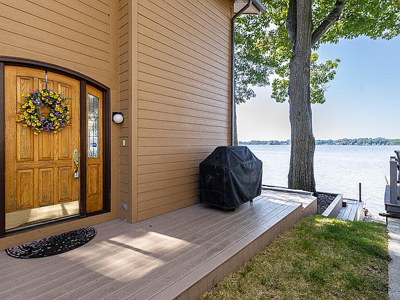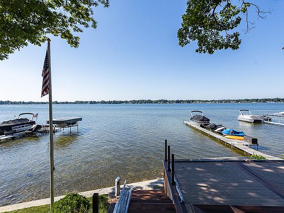 Beautiful 2-story brick & stone lake home on Cherry Point with southern exposure. Great beach. Open floor plan. Spectacular views of lake. Total second story is primary suite - bedroom, bathroom, washer/dryer hookups, walk-in closets, & private balcony. Alarm system. 10-ft ceilings in basement. Double surround sound. 200 amp electric. Whole-house generator. In-ground sprinkler system. State of the art 4-car heated/cooled garage w/backup electric heat & brick paved driveway. Garage also includes half bath, built-in air compressor, & pull-down attic storage. All new synthetic deck & railings. New roof. New 5-zone energy star radiant heat system & central air. Large extra lot behind garage with cement pad for boat storage plus grass area & professionally landscaped.