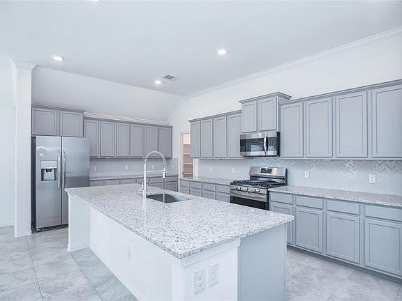 High ceilingGas stoveGas ovenOpen floor planStainless steel appliancesGranite island kitchenWalk-in pantry