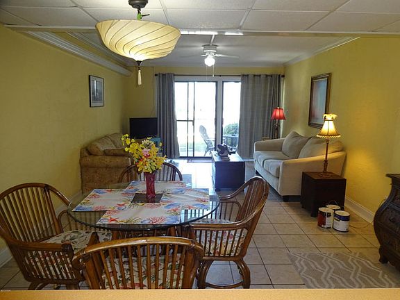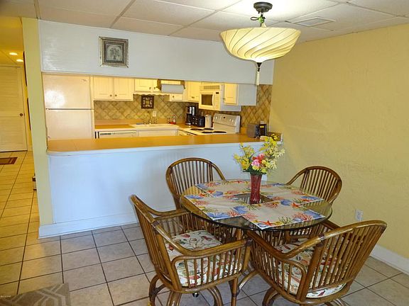 Very well maintained ground floor unit features tile throughout with numerous updates including adjustable recessed lighting in bedroom and living room, updated bath, updated kitchen cabinets and counter tops. Washer and dryer in unit. Freshly painted throughout. Being sold fully furnished and appointed. Ground floor affords quick and easy access to well kept courtyard, swimming pool, tennis courts, community room, outdoor grilling area and dedicated beach. Park right in front of your unit. Convenient location is within walking distance of restaurants, shopping and family entertainment venues. The neighborhood feel of this complex has made it a sought after destination for family vacations as well as investors. A must see complex..