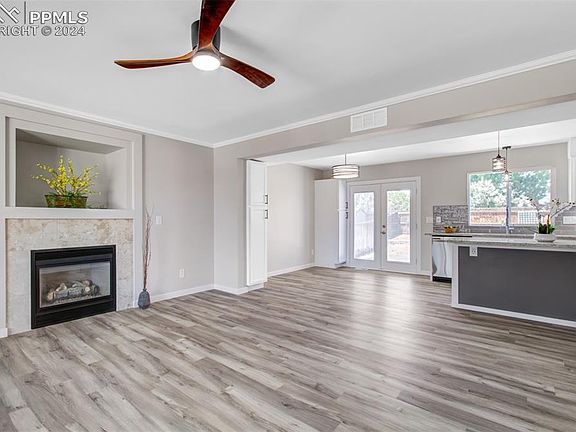 Welcome to this beautifully updated home located within an easy commute to Ft Carson. This home has been completely updated both inside and out. As you enter the home from the quaint, covered front porch, you will immediately notice the new LVP floors throughout the main level. The living room has a cozy fireplace for those chilly Colorado evenings and opens to the stunning kitchen/dining remodel with all new cabinets, new island, granite countertops, all new appliances, light fixtures and more. There is a completely updated powder room and laundry room on the main level, next to the garage entrance. Upstairs you will find the primary bedroom, with new carpet, lighting and attached remodeled primary bath with double sinks. There are 2 additional guest rooms and a fully updated guest bathroom upstairs as well. The full basement includes a family room & guest bedroom with all new carpet, paint and light fixtures. The downstairs bathroom has been fully updated with new lighting, fixtures, granite & sink. All main floor and upper floor windows have been replaced, new paint both inside and out, new roof, new front landscaping. There is not a surface in this home that has not been touched. Even the garage has a new epoxy floor and doggy door. The outdoor living spaces are plentiful. The front porch affords a great place to sit in the shade and talk with neighbors & friends while the large back patio is ready for your next bbq or party. The backyard already has an auto sprinkler system and is waiting for your final touches. Don't hesitate, come and see this beautiful home today!