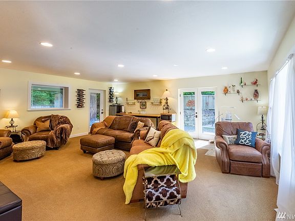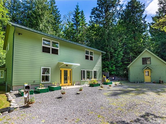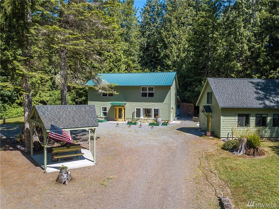 Relax in this wooded, private retreat. Six acres of forest & trails surround the home & guest cottage. Home is fully furnished, turn-key. Living room opens to a covered patio for outdoor living. Impressive master on main has vaulted ceilings, walk-in closet, skylights + stylish bath w/tiled walk-in shower & bench. Great room upstairs & second master suite. Kitchen boasts updated SS appliances & tile floors. Cozy guest cottage w/wood stove, 3/4 BA, & kitchenette. Please, no drive-bys.