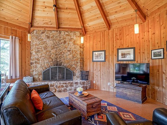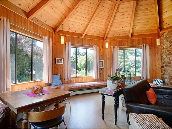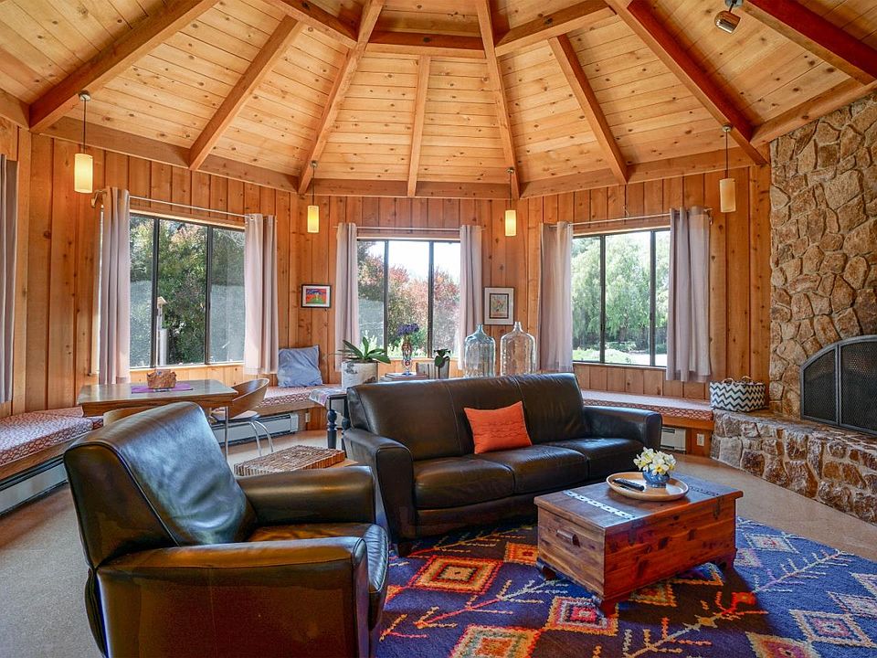 This expansive home offers a truly unique design. Custom built around a central Octagonal shaped Great Room which includes a dining room with kitchen, this room brings twenty-two foot soaring ceilings with an apex at a new circular skylight. An abundance of windows and French Doors lead to the verdant meadows of Carmel Valley. The Great Room is connected to four other Octagonal shaped rooms, each one being 550 square feet, with two full baths conveniently located. There is a gorgeous Living Room with wood and stone work, as well as an expansive wood burning fireplace. The Octagonal master suite has generous windows presenting outstanding views of the mountains and meadows. Another of the Octagons is divided into two bedrooms with a 450 square foot loft exhibiting another grand skylight. The fourth Octagon comes with its own half bath, a sauna, walk-in closet and an exit into the garage. A voluminous four car garage could easily accommodate a lift, has 220 installed and metal roll-up doors that open onto a generous parking pad and driveway. A She-Shed, precious two story Tree House and Carmel Schools close by, this home is a must-see. You'll find it by its brand new metal roof and lovely drought resistant landscaping.