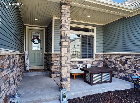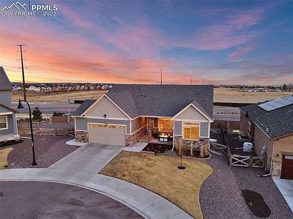 Enjoy main level living in this inviting ranch-style home w/Mtn views in Banning Lewis Ranch! Covered front porch. Solar-powered. Tall front door w/beveled glass. Luxurious vinyl plank floors thru most of the main level. The Entry leads into a formal Din Rm (currently a Sitting Rm) & also a Powder Bathroom w/pedestal sink. The Great Rm features sur sound speakers, a gas-log fireplace, & wall of windows providing abundant natural light. The Great Rm flows into the Gourmet Island Kitchen & Dining Nook that incl a wall of cabinets w/quartz counters & beveled subway tile backsplash. Walk out to a large composite deck w/stairs to the backyard. The Kitchen has a counter bar, pendant lights, pantry, & tall cabinets w/quartz counters, tile backsplash, & view windows. Appl incl a filtered water tap, gas range cooktop, dishwasher, double ovens, microwave, & French door refrigerator. Mud Rm off the Kitchen has garage access & Laundry Rm w/washer/dryer. 3 main lvl bedrooms (1 currently used as an office). Full hall bath. The Primary Bedroom offers a lighted ceiling fan & barn door into a luxurious Shower Bathroom. The MBath provides a dual sink vanity, walk-in shower w/mud-set stone floor, & walk-in closet. The Basement has 9ft ceilings, hosts a Family Rm, Storage Rm, Bedroom w/walk-in closet, Bathroom, & Safe Rm. Extras incl A/C, humidifier, curtains/rods (except those excluded), window blinds, well covers, sec sys (incl motion detectors, glass break sensor, video doorbell, door keypad, & camera), hot water recirc pump, & humidifier. 2-car attached garage w/door opener & storage. The fenced backyard hosts a walkway to the front & concrete patio for outdoor relaxation. Banning Lewis Ranch amenities incl the Ranch House w/fitness & meeting centers, 2 outdoor pools, 75+ acres of parks/trails/open space, climbing park, splash pad, seasonal water park, dog park, pickle ball courts, tennis courts, community garden, & award-winning Banning Lewis Ranch Academy.