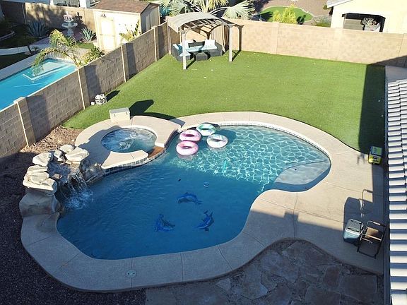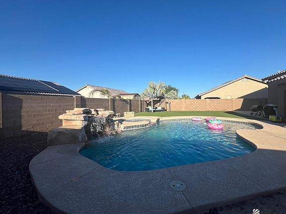 New Price! $457,500 - Discover one of the best-priced 5-bedroom pool homes in the highly sought-after Savant Estates! This spacious property offers a versatile floor plan featuring a teen room/den separating three bedrooms—perfect for added privacy in large households. The oversized master suite boasts a huge walk-in closet, dual sinks, a tile snail shower, and a private toilet area. Tall vaulted ceilings and an open kitchen with separate dining create a bright, expansive feel throughout. Step outside to a fully landscaped backyard showcasing a sparkling pool, relaxing jacuzzi, water feature, and a large synthetic grass area for minimal maintenance. The side yard is already concreted with a wide double gate—ideal for RVs, trailers, or toys. This rare 5-bedroom pool home in Savant Estates checks all the boxes at an amazing price! (Some pictures had been AI enhanced)