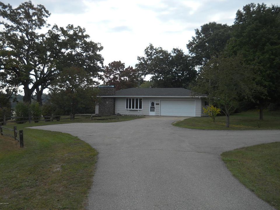Piece of Paradise! 11 acres with apprx. 378 feet of frontage on Ranney Lake, a quiet fishing no wake lake between Greenville & Belding. The ranch style house features a living room with a wood burning fireplace insert, nice windows to view the lake, lots of woods, 3 bedrooms, 1 1/2 bath, kitchen & dining area. The lower level is partially finished, the unfinished side has the mechanicals and laundry, plus lots of nice storage space.There is a vinyl lined in ground pool (which hasn't been maintained for 7-8 years), a bar area & changing room, all surrounded by a privacy fence. In addition to the two car attached garage, there is an additional 24 x 24 garage with another storage area behind that. The house is neat & clean and ready to occupy. Call for private walk-thru & more details.
