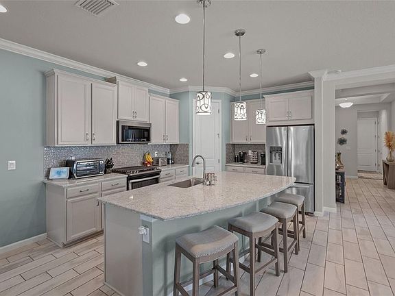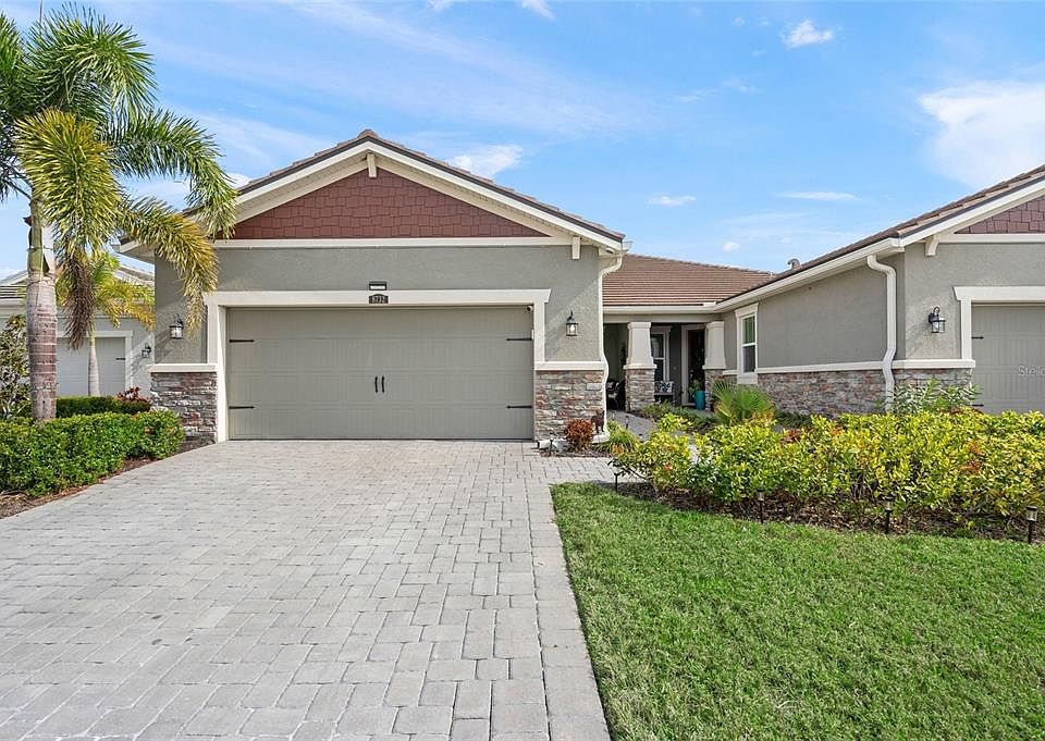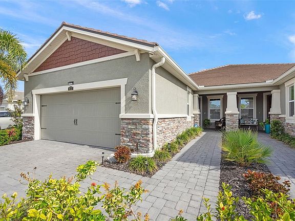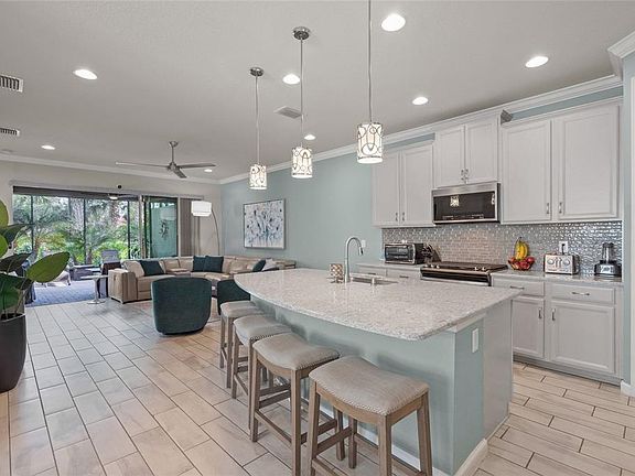 Beautiful Craftsman-style elevation in the maintenance-free villa community of Sunrise Preserve! Flood Insurance is not required for this property! This versatile, open-concept floor plan offers 1,677 sq. ft. with 2 bedrooms plus a den/study. Crown molding throughout adds an elegant finishing touch. The light and bright kitchen is the heart of the home and ideal for entertaining, featuring light gray cabinetry, quartz countertops, a center island, pantry, and upgraded stainless steel appliances with a gas cooktop. The separate, spacious dining area flows seamlessly from the kitchen and accommodates larger gatherings. The great room is generously sized and easily fits a variety of furniture arrangements, perfect for relaxing or movie nights. The primary suite features a tray ceiling, recessed lighting, and an ensuite bath with a shiplap accent wall, frameless glass shower, and walk-in closet. The den/study includes added doors for privacy and a charming front-facing window. The guest bedroom is conveniently located next to the guest bath, which also features a glass shower and quartz counters. Stylish tile flooring flows continuously throughout the entire home, offering easy maintenance and a clean, cohesive look. Enjoy outdoor living on the extended 15’ x 18’ screened and pavered lanai with a privacy wall and lush landscaping. An open pavered area and backyard offer a convenient, pet-friendly outdoor space. Additional highlights include tasteful fixtures, Minka fans, extra recessed lighting, an interior laundry room with utility sink, attic stairs for extra storage, and an attractive epoxy-finished garage floor. The monthly maintenance fee covers the roof (cleaning, repairs, & replacement), exterior paint, exterior insurance, and all the wonderful amenities. Sunrise Preserve offers exceptional amenities, including gated entry, clubhouse, fitness center, pickleball and tennis courts, bocce ball, resort-style pool and spa, poolside grills, firepit, and covered outdoor seating. A full calendar of events and clubs makes it easy to stay active and connect with neighbors.