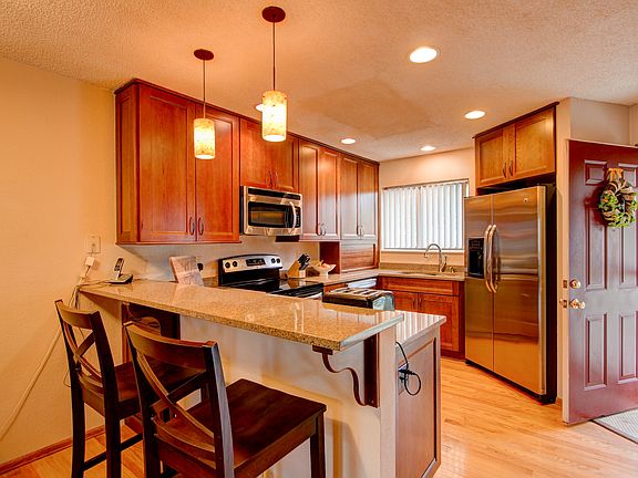 This adorable Lakewood townhome is warm and inviting. You will be immediately impressed by the renovated kitchen with 42” cherry cabinets, slab granite counters, all stainless steel appliances, and breakfast bar. The hardwood floors lead into the family room where you can enjoy the warmth of a wood-burning fireplace. The upstairs features newer carpeting, and accommodates 2 bedrooms, plus one bathroom. The master has a vaulted ceiling with a skylight to bring in natural light. Attached to the one car garage is a laundry/storage room, which could easily be converted into additional living space.