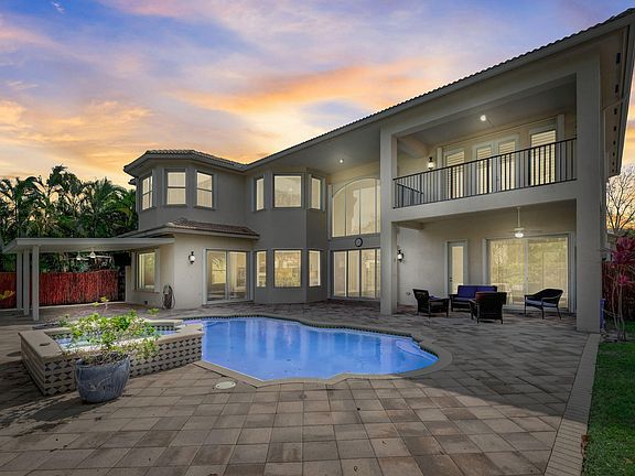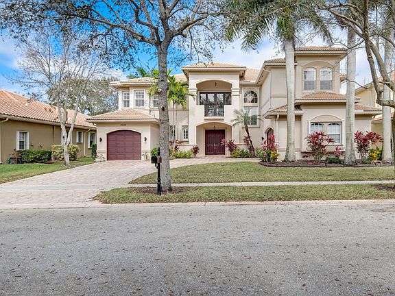 This stunning 5-bedroom, 5.1-bathroom home is nestled on a quiet cul-de-sac in the luxurious Canyon Isles community. It stands out as not only the best-priced home on the market in the area but also one that matches the amazing vibes of true Florida living. As you step inside, you are greeted by soaring ceilings and porcelain wood-like tiles. The dining room reveals a custom wet bar, while the kitchen showcases white wood cabinets and a spacious custom center island topped with quartz counters and stainless steel appliances. The family room opens to a private backyard featuring a heated pool and spa. Recent servicing ensures the air conditioning units are in prime condition, and accordion shutters provide storm protection during inclement weather. Upstairs, laminate wood floors lead you to the expansive primary suite, complete with a separate sitting room. The primary bath offers a Jacuzzi tub and wood cabinets. Additionally, there are three spacious guest rooms, each with private en-suite baths, and a loft that opens to a balcony overlooking the property. Situated in one of Palm Beach County's premier clubhouse communities, this home is within walking distance of excellent schools, shopping, and Canyon District Park. Don't miss this chance to experience luxury living in a highly desirable area!