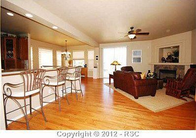 Better than New! Located in "Best of Springs" Wolf Ranch, this pristine Rosewood rancher features main level living at its finest. Enjoy your 3 car garage, elegant hardwood floors, open floor plan & mountain views. Upgraded kitchen features 42" cabinets w/crown molding, Corian counters w/seamless sink & counter bar, lighted glass display shelving, pantry & all appliances stay including gas stove. The spacious master has mountain views, large soaking tub, free standing shower, double vanity & large walk-in cedar closet. The entry has oak hardwood floors with an upgraded inlay of grey tile. The spacious & open dining room has hardwood floors, upgraded Roman shade window treatments & the dining/living room walks-out to the flagstone patio. The open living room features a cozy gas stone fireplace perfect for winter days. The good sized laundry room is on the main floor between the garage & the home - perfect for kicking off dirty shoes & keeping the home clean. The spacious study is also on the main floor and features elegant French doors. Three good sized bedrooms & huge family room greet you downstairs. Also included downstairs are a full bath w/double vanity & separate shower room & a finished bonus room. Other features you'll love: vaulted ceilings, one-of-a-kind stucco color and stone exterior, professional landscaping w/eleven trees, four bird baths, two patio lounge chairs, & cool air conditioning for hot summer days. Ideally located between Air Force Academy & Peterson Air Force Base with easy access to Powers Blvd, this home is also near district 20 schools, shopping, workout facilities & one street away from the swimming pool. See all the features of this fantastic home today.