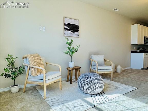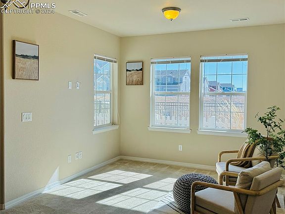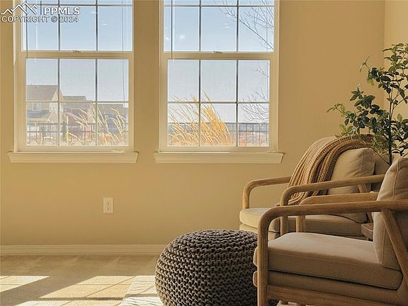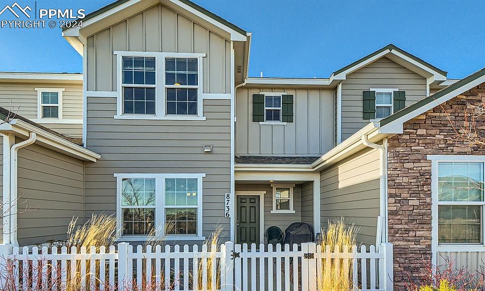 This beautiful townhome boasting 2 bedrooms and 2.5 baths is nestled in Wolf Ranch community and the award-winning Academy D20 Schools, Colorado Springs. This property showcases a private fenced front landscaping and patio areas leading to a captivating view of Pikes Peak. Upon entering, the open concept floor plan with 9-foot ceilings on the main level is immediately apparent. The south-facing Living Room features numerous large windows, inviting ample natural light that's perfect for indoor plants. The Dining Room sits between the Living Room and Kitchen, where stainless steel appliances, upgraded cabinets, a pantry, and a spacious island with counter seating adorn the space. Additionally, there's a convenient half Bath on the main level. Heading upstairs, a sizable loft welcomes you. The Master Bedroom boasts large windows, a walk-in closet, and an adjoining full Bath. The secondary bedroom and bathroom are also situated on this level, with the added convenience of upstairs laundry. Central A/C and heating ensures year-round comfort. This home gives plenty of parking with a 2-car attached garage with a few steps up to the main level, a driveway that fits another 2 cars, and lots of guest parking along the streets inside the community. Residents can enjoy proximity to parks, a community pool, clubhouse, walking trails, and more. This property also offers great potential for rental income, subject to certain HOA rental restrictions. Conveniently situated in proximity to shops, restaurants, and CO-21. Some listing photos are virtually staged,