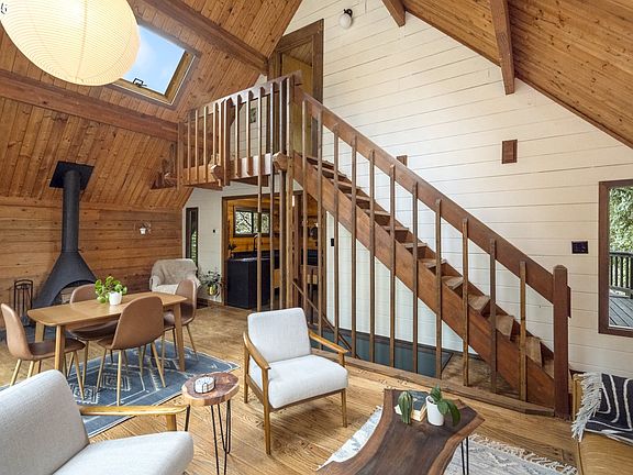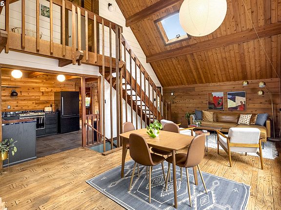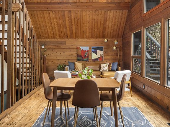 Welcome to the Almost A-Frame, an architecturally noteworthy mid-century retreat designed for seamless connection with nature. With soaring vaulted ceilings, expansive windows, skylights, and central A/C, this modern chalet is both breathtaking and comfortable. Tucked among the trees and thoughtfully recessed from 46th Street, it offers unparalleled privacy. Start your mornings with a hot bevie on one of four expansive decks or nestled by the wood-burning fireplace, all while being surrounded by lush PNW landscaping from every angle. Bordering a 46-acre nature preserve, the home provides an ever-changing natural backdrop. For outdoor enthusiasts, the Marigold Trailhead is just steps away, offering direct access to the beauty of the PNW. Despite its secluded vibe, this A-Frame is just a short stroll to Multnomah Village and only a 10-minute drive to downtown, making it the perfect blend of tranquility and convenience. Offer deadline is 3:00 pm on Monday 03/17. [Home Energy Score = 6. HES Report at https://rpt.greenbuildingregistry.com/hes/OR10216916]