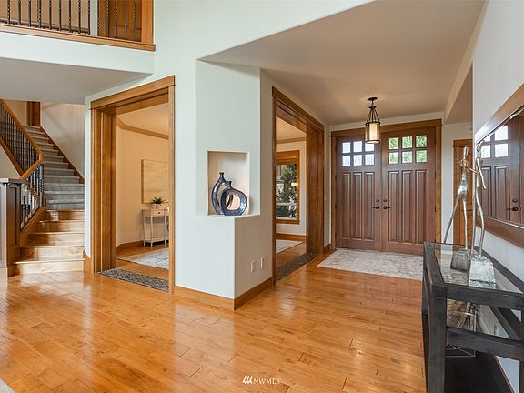 Immaculate custom PNW Craftsman home on a prime, double-fairway western view lot in the gated Semiahmoo community. Enjoy outdoor entertaining on the huge 1087 sqft partially-covered patio with stone fireplace. Primary suite on main level with door to patio. Great room with exposed timber truss vaulted ceiling and dual-sided stone fireplace. Updates within the last year include: new carpet, interior paint, high-end audio/visual system with multi-room sound system and attached 4K HDTVs, Hunter Douglas blinds, ceiling fans, lighting, and more (see list in home). Mature landscaping with sprinkler system. Meticulous workmanship, quality materials and luxury finishes that you won't find in new construction at this price. View the virtual tour!