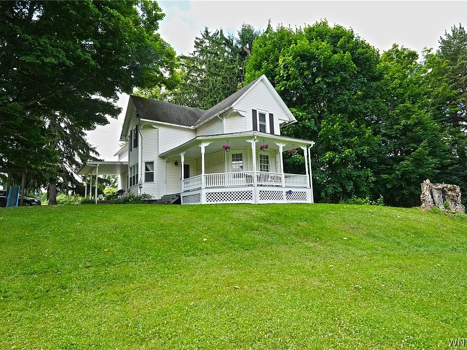 Welcome to your idyllic countryside retreat! Nestled on 6 picturesque acres in the heart of Colden and located within the East Aurora School District, this 2450SF classic farmhouse offers the perfect blend of rustic charm and modern convenience. Boasting 4 spacious bedrooms and 1.5 baths, this home is ideal for those seeking a serene, rural lifestyle with the comforts of contemporary living. The good sized kitchen has plenty of cabinets and beautiful quartz countertops. The first floor also include a spacious den with cherry book shelves, a large formal dining room, living room and a sitting room with a wood burning stove. Enjoy the The sprawling 6-acre lot is home to a huge barn, perfect for storage, hobbies, or even a small-scale farming operation. The charming chicken coop adds to the authentic farm experience. Delight in the abundance of raspberry, mulberry, apple, and pear trees scattered throughout the property. 10-15 Minute drive to the Villages of Orchard Park or East Aurora and 10 minutes to Kissing Bridge! Offers bring reviewed as they are received. Don’t miss out on this wonderful home!