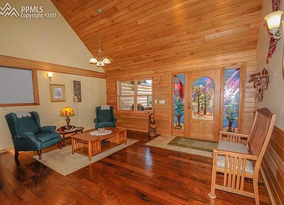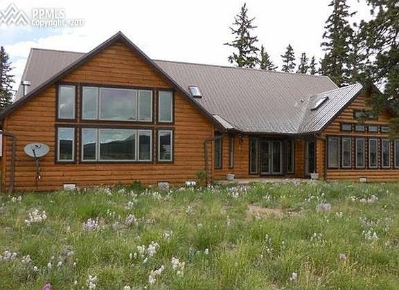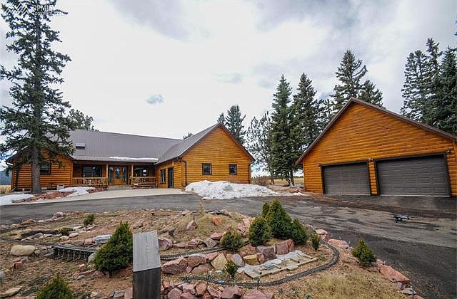 Exclusive custom log-sided ranch home on private 4-acre lot overlooking open meadows with with stunning Pikes Peak views. Located in Pine Ridge gated community just minutes from Woodland Park. This home welcomes you with a covered front porch and custom hand crafted stain glass door. Formal dining room features a custom rock wall and pass through to the kitchen. A spacious office showcases a circular staircase that leads to the upstairs guest suite. Gourmet kitchen has extensive cabinetry, a beautiful island with counter seating, double oven, walk-in pantry and vaulted ceilings. Spacious great room with 18' vaulted ceilings has stunning open views from a wall of windows and gas log fireplace that opens to kitchen and patio. Master suite features French doors, huge walk-in closet, and 5-piece bath with soaking tub. Bonus spa/sun room with luxurious hot tub off the master suite also has mountain views. Large second bedroom suite with bath on main level. Laundry room has a sink, dog shower, cabinetry, and closet. Huge rec room with dry bar and room for pool table, table tennis, game table and much more. Additional home features include radiant floor heating, beamed ceilings, new windows, washer/dryer, skylights, window coverings, whole house sound system, invisible pet fence, new gutter screens, an insulated 4' crawl space, and 2 two-car detached garages with RV parking.