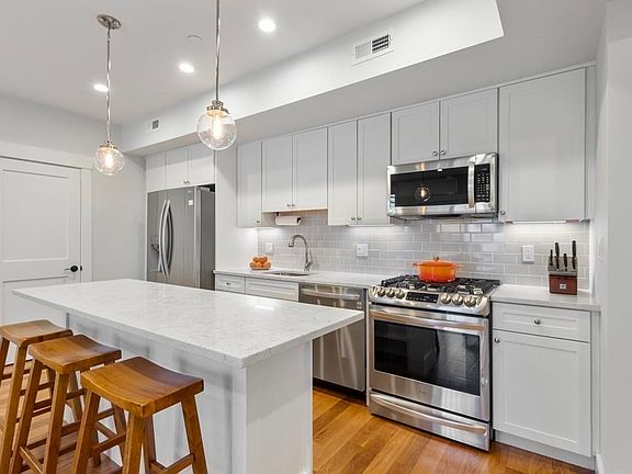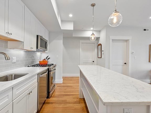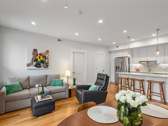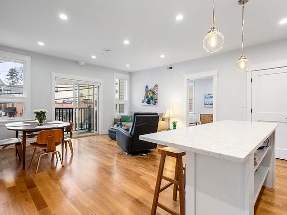This stunning 2020 new construction condo in the heart of Roslindale Village has it all! With two good-sized bedrooms and 2 full bathrooms, this sunny unit features beautiful hardwood floors and high ceilings throughout. The open floor plan seamlessly connects the kitchen, living, and dining areas, creating a spacious and inviting atmosphere. The white custom-made kitchen boasts quartz countertops, gas cooking, stainless steel appliances and an island perfect for entertaining. Convenience is key with in-unit laundry. Enjoy the outdoors on your own balcony and take advantage of the heated driveway during colder months. The condo includes elevator access to one garage parking spot, wired for an EV charger, and a private storage area. There is also a shared outdoor patio. In close proximity to the commuter rail to Boston, Fallon field, the Arboretum as well as many eclectic shops and restaurants on and around vibrant Roslindale Square.