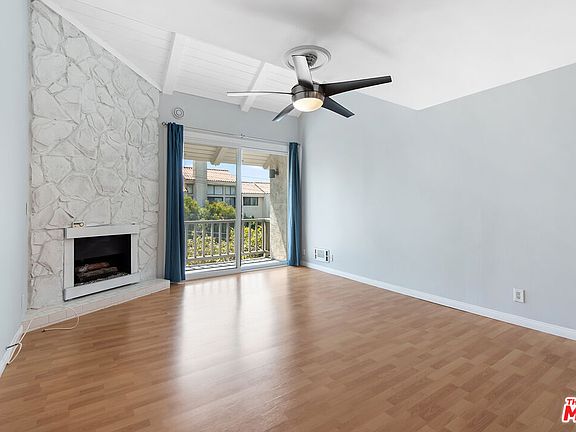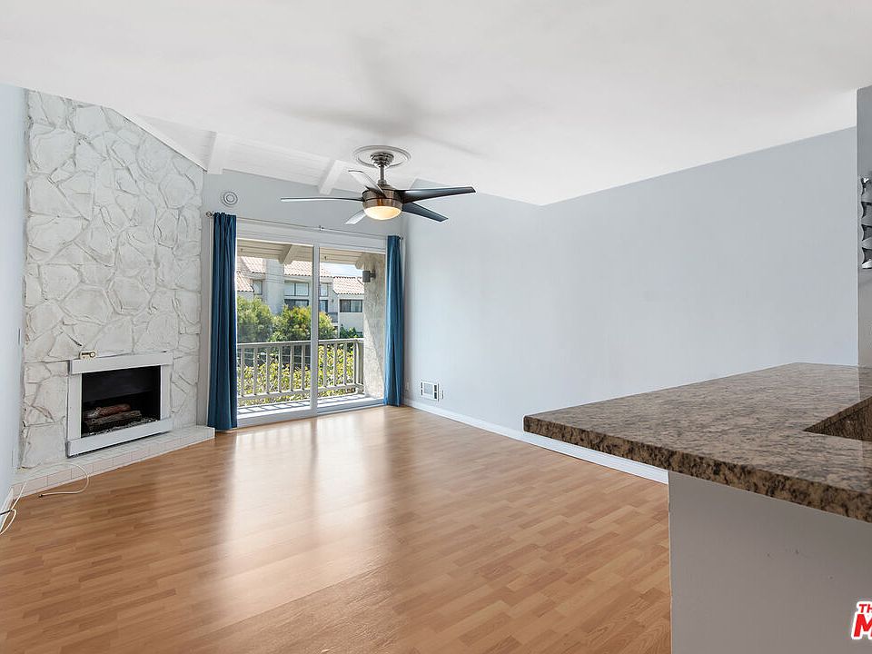 Beautifully updated top-floor 1-bedroom, 1-bathroom front facing unit at Del Rey Plaza. This spacious, light-filled home features wood floors and a generously sized living room with vaulted shiplap ceilings, a cozy fireplace, and sliding glass doors that open to a private balcony offering treetop views. The updated kitchen includes granite countertops, stainless steel appliances, ample cabinetry, a breakfast bar, and adjacent dining area with extra storage. The well sized bedroom offers high ceilings and ample closet space. Unit also comes with one parking space. Building amenities include a pool and community laundry on every floor. Conveniently located near shopping, schools, beaches, restaurants, bars, and a scenic bike path.