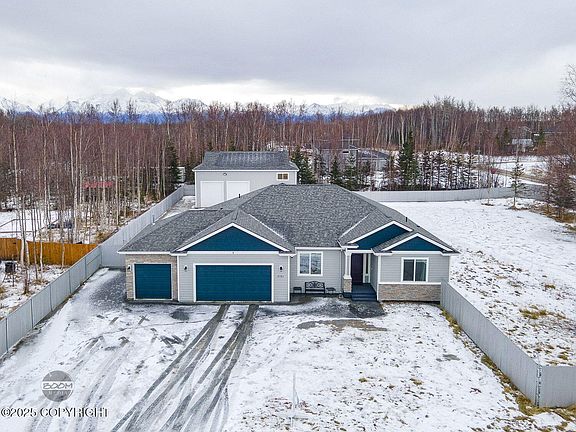 Welcome home to this stunning 4-bedroom, 2-bathroom residence on a 40,075 sq ft fully fenced lot. This property is a dream for those seeking space, comfort, and versatility!Step inside and enjoy an open-concept floor plan with modern upgrades throughout. The southern-facing living room is bathed in ample natural light, creating a warm and inviting atmosphere.A cozy fireplace adds charm and comfort, making it the perfect place to relax year-round. The private master suite offers a quiet retreat, complete with elegant finishes and thoughtful design. The beautifully designed kitchen boasts high-end finishes, ideal for entertaining. One of the standout features of this property is the massive 32' x 46' heated detached garage/shop with in-floor heat, a 475 sq ft mezzanine, and two oversized garage doors (10' wide by 12' tall) ideal for storing vehicles, RVs, boats, or pursuing your next big project. Additionally, the attached garage offers even more convenience. Outdoor living is at its finest here! Enjoy the expansive 1,150 sq ft Trex deck, perfect for gatherings, grilling, or soaking in the beautiful Alaskan surroundings. With ample RV parking, a fully fenced private yard, and a prime corner lot location, this home offers everything you need for both work and play.