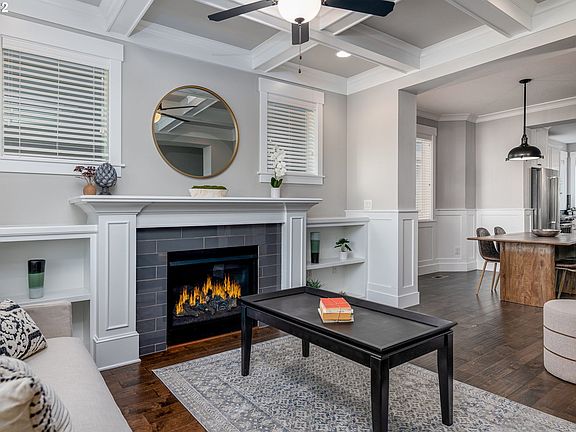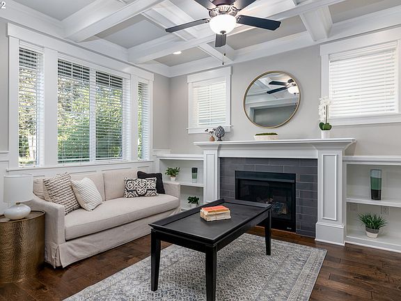 - Features: Beamed Ceilings, Bookcases, Ceiling Fan, Fireplace, Engineered Hardwood
