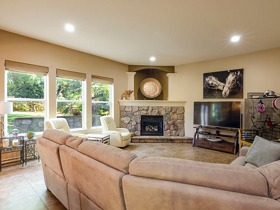 Great room style w/corner rock fireplace, 4 bedrooms or 3 beds w/4th as media/bonus room, dining room, den. High ceilings, zonal AC. Master w/fireplace, double walk-in shower, built in cabinets, WI closet. Kitchen has hardwoods, island w/eating bar, newer SS appliances. Private backyard fenced w/patio, gazebo, water feature. Clackamas Co and Happy Valley schools! Original owners.