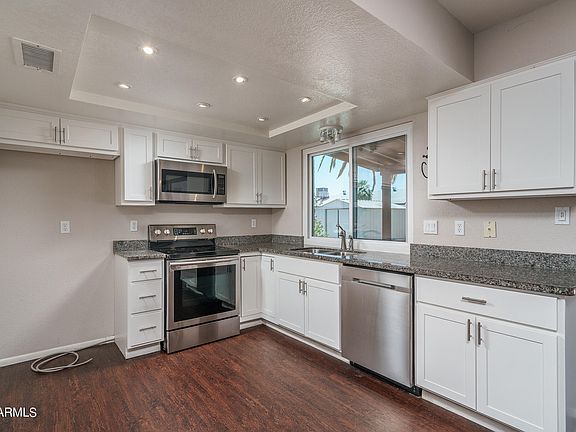 Welcome to this beautifully updated home in Peoria! With 2 bedrooms, 2 bathrooms, and a great room this floorplan has no wasted space! You will love the shutters, new windows, and neutral tones throughout! The great room is spacious. The kitchen has granite countertops, stainless steel appliances, and beautiful modern white cabinetry. The dining room has 2 new French doors! The primary suite has a large walk-in closet and an ensuite bathroom with a dual sink vanity. The backyard is spacious with a shed and easy care landscape and a covered patio! Do not miss out on this move-in-ready home!