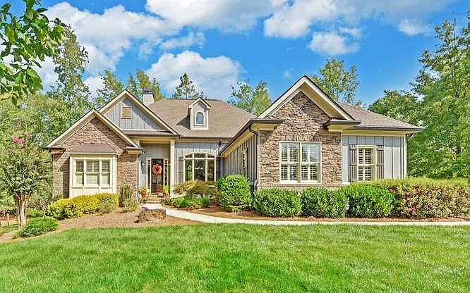 Experience your dream home with this exquisite rambling one level ranch style home, located in the North Hall school district. With 4 bedrooms and 4 full baths of sprawling space and a long list of upscale features, this home boasts an unbeatable mix of elegance and comfort. As you enter you will be welcomed with an open foyer, dining, and living room with 12' ceilings and extensive trim work. The living room features stained coffered ceilings, stack stone f/p, built in cabinets and bookcases, surround sound thru out the home, site finished hardwoods in every room with the exception of tile in the baths and laundry. The kitchen features an open breakfast room, spacious keeping room with a stack stone f/p, and double doors to the oversized deck. There is an abundance of kitchen cabinets, Kitchen Aid appliances, double convection wall ovens, 36 inch induction cooktop, warming drawer and pantry with Carolina Closet built ins. The primary suite is very large with a trey ceiling, luxury bathroom outfitted with tile shower, bubble tub and his/her closets with Carolina Closets system. All the secondary baths feature deep soaking tubs with tile shower surrounds. Two of the secondary bedrooms feature a Jack N Jill bath with custom vanity. The garage is a side entry 3 car garage with garage floors and cabinets finished by Premiere Garages. Gutters with gutter guards and irrigation system in place. The enlarged deck has a portion over the patio that has under shield coverage leading to dry paver area and fire pit. The lot is situated in the cul-de-sac and features mature landscape with year-round privacy. The full daylight basement offers over 2700 square feet, a storm shelter, fully finished bath and an abundance of space framed ready for sheetrock.