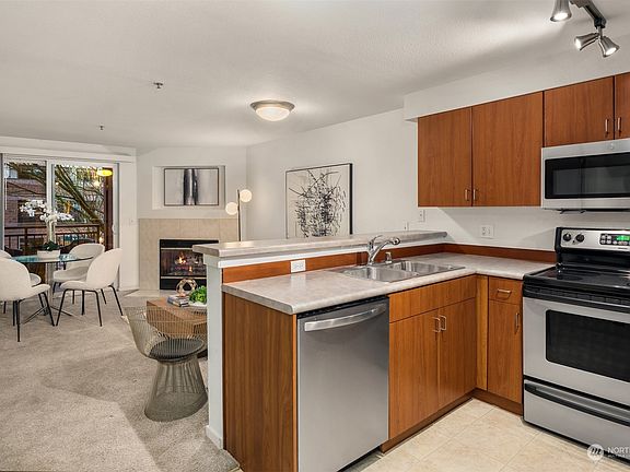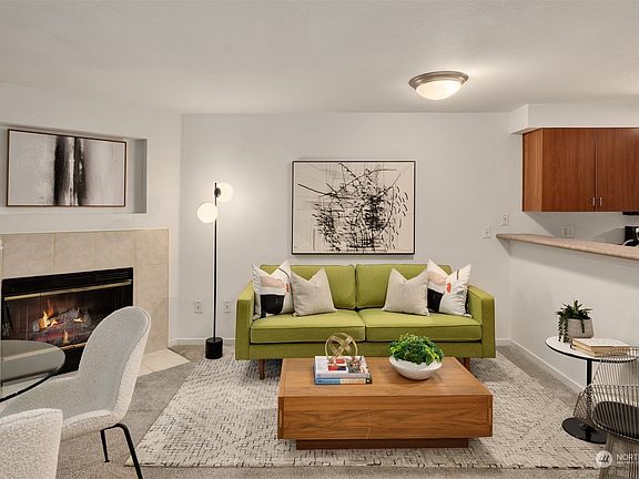 Greenwood condo offers it all with open-concept floorplan + bright interior spaces. Large living room is highlighted by inviting fireplace. Sliders lead to balcony that expands opportunities for entertainment or outdoor relaxation. Updated kitchen features stainless appliances + great cabinet space. Utility room offers full-sized washer/dryer as well as additional storage. Sunny bedroom provides perfect escape + roomy closet contains built-in shelving. Bathroom is contemporary in style. Condo located in walkable neighborhood with easy access to restaurants + parks. Secure, pet-friendly building boasts elevator + parking garage. Owners will appreciate low HOA dues. I-5, public transit nearby.