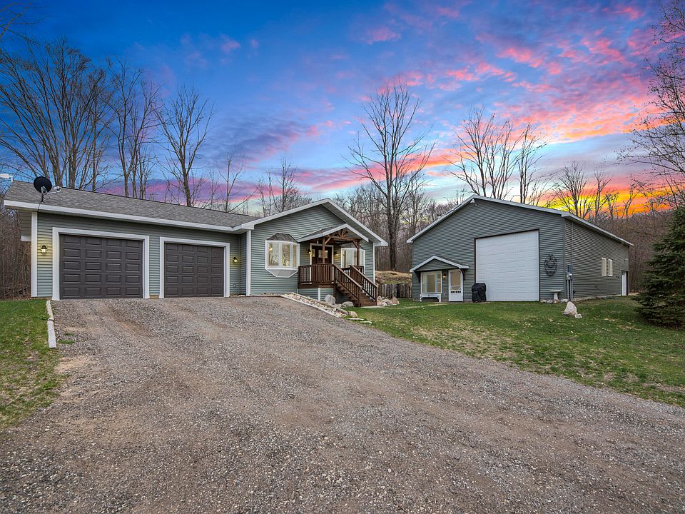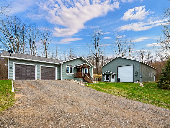 Truly a one-of-a-kind property! This brand new home and pole barn house combo holds immense value and charm, in a unique and desirable setting that will be very hard to match. Lets start with the custom built home. Everything you need is on the main floor, and the pleasant layout is tuned in provide warmth, convenience, and comfort. The full basement can furnish 1-2 bedrooms, an additional full bath and completely finished living space. The pole barn house is an incredible treat. Soaring ceilings and walls surround a full kitchen, bathroom, living space, and lofted master bedroom. There is opportunity and storage everywhere inside this over-sized structure, ready to serve your every storage or entertainment need. 10 acres of rolling woods are outside, waiting to be explored. Don't wait!