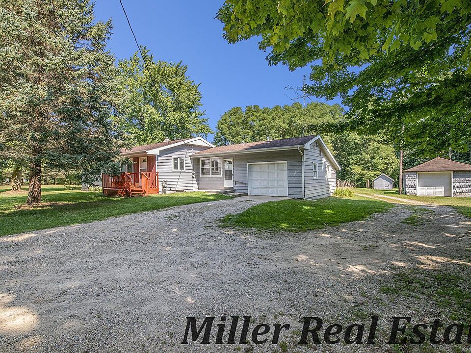Affordable country ranch on 2 +/- acres. This ranch home sits just outside of Caledonia, right around the corner from Saskatoon Golf Course, and a short drive to the Coldwater & Thornapple Rivers offering plenty of outdoor entertainment options. This home features 2 bedrooms, 1 1/2 baths, main floor laundry, dining area, living room, kitchen & a 4 seasons porch that overlooks the park like setting. Outside you will find a fenced in back yard perfect for the pets or young ones. If you need storage for your hobbies there are multiple outbuildings to choose from including a 2nd garage, a pole barn with lean-to & a chicken coop. Mechanically this home is set with newer roof, furnace & replacement windows. Lower level has a rec room that is ready to be finished.