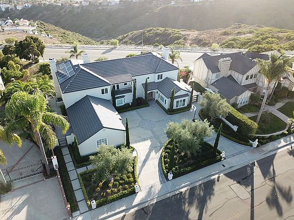 Perched at the top of prestigious Mariner's Point in San Clemente, this custom built home is sophisticated, yet provides for relaxed beach town living. Enjoy breath-taking 180-degree ocean, waves, coastline, golf course, and city light views from San Diego to Catalina in this 3-story, 6,000 sqft designer home. Get your own daily Trestles or T-street surf report just by looking out from the house windows, back decks, or standing in the backyard. Residing in a quiet neighborhood, this property is truly a signature beach house estate in San Clemente for refined living and elegant entertaining. Key features include: up to five bedrooms (3 ensuite; MBR has fireplace and separate his/her walk-in closets), 5.5 baths (with custom and boutique vanity sinks and fixtures from Brizzo, Hansgrohe, Keuco, Restoration Hardware, Speakman, Toto, and Victoria + Albert), formal living and dining rooms, grand family room with full home theatre, immense bonus pool room with full home theatre, incredible chef's kitchen (with appliances from Viking, Subzero, and KitchenAid), custom built pantry with soft-close drawers, full-feature wet bar with wine refrigerator, cabinetry and sink, separate large laundry room with immense cabinet/drawer storage, built-in laundry folding table, built-in dog/pet "condo", two house patio decks, one large resort-style backyard deck with custom spa/pool, custom BBQ with Lynx appliances and quartzite stone, full backyard home theatre, and a second larger backyard deck with designer dining table and daybed overlooking a lush backyard with olive trees and curated landscape; front house motor court, custom windowed front "pivot door", a 3-car garage with high-volume custom garage storage cabinets, a 500 sq. ft. storage attic, and massive side yard storage areas. This home is "smart" with mobile app/wifi-enabled thermostats, solar panels, fire/CO alarms, video security system, garage door openers, water fountain features, and a custom Tesla/EV charging connection.