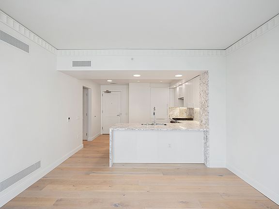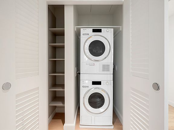 Residents have access to a full suite of amenities: a fitness center with a dedicated yoga room, a shared rooftop terrace with sweeping views of the Financial District, a resident lounge with a catering kitchen for entertaining, and a serene Secret Garden, an urban oasis in the heart of the city.