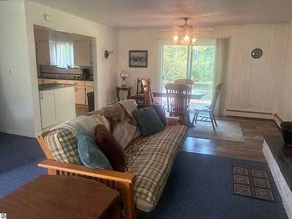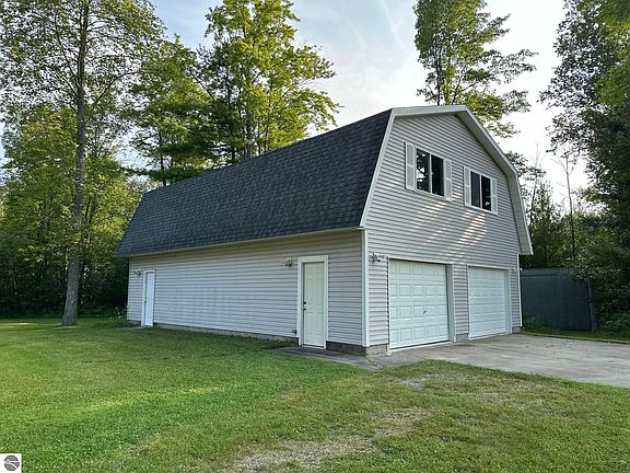 Are you a hunter, backwoods person, mechanic? And do you still enjoy the comforts of a nice year round or seasonal home? Or perhaps that will make the spouse or significant other happy? This 3 bedroom 1248 sq.ft. year round home sits on two wooded acres next to thousands of acres of public land, not far from forest roads and trails. This home has a number of recent upgrades and improvements including a fresh bright kitchen with newer flooring in the kitchen and dining area. New windows installed throughout. You will find an airtight wood burning fireplace for cozy fall and winter days. There is an attractive wood stained deck off the dining area overlooking a small pond and for viewing nature. Plus you will find a 28'x40' garage with two bays and a very large work room in the back with a large separately metered service panel. The hip roof garage, reroofed in 2021, has a full stairs going up with subflooring installed above, pre-plumbed for a full bath, providing an area for significant future living space. You are the last home on the road before a short distance to a couple nicely kept hunting camps and then nothing but woods and trails. Some furniture is included.