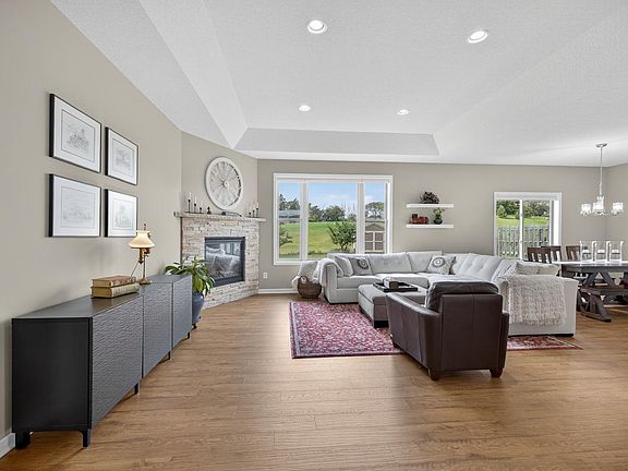 This stunning open concept home, on the seventh hole, was originally a builder’s model. The well thought out 4-bedroom, 3-bath home offers a timeless modern design, perfect for family and entertaining. Today, this home shows like new, and has one of the most desirable flat back yards among the irregular landscape of the Highlands golf course community, next to the Zumbrota Golf Club. Upon entry, natural light fills the room featuring 10’ ceilings, a tray ceiling, an open stairwell highlighted by metal and natural wood railings. The kitchen features elegant granite countertops, stainless steel appliances, with gas range, tile backsplash, bright kitchen cabinetry with ez close drawers and center island. Hand scraped wood laminate flooring accents the main floor. The dining area steps onto a covered deck overlooking the backyard dotted with maple/ cherry trees and a 10’ x 10 storage building. You’ll appreciate the large bedrooms; three have walk-in closets. The master bedroom offers an ensuite bath, walk-in closet. The lower level includes a large family / great room, with extra space which could be a future office/den. The single level living concept continues with a main floor laundry, complete with pantry, wall cubbies and seating. Both the garage, and lower level, features a workshop/ craft room. The utility room is equipped with a passive radon system, high efficiency furnace with humidifier. Ideal location for access to Rochester or the twin cities. Move in ready, non-smoker, no pets.