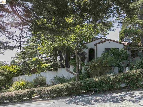 This spacious, handsome Hacienda is sited on a very large lot with spectacular bay views. Level entry from garage! While technically a 2-bedroom home, the square footage is exceptionally large for 2 bedrooms, and there are several bonus spaces that expand its size and functionality to be more comparable with a much larger home. There are 3 full baths, 2 garages, a home office off the master suite that could also be adapted as a nursery or child's room, and a large lower level, with a full bath, that could be adapted or expanded into additional living space. This rare and special home includes many lovely authentic architectural details, as well as generously proportioned rooms, abundant natural light, wonderful indoor-outdoor flow, and many inviting outdoor areas -- the entire property is designed to enhance the sensation of living in a natural, sun-drenched and sylvan oasis. The remodeled kitchen and master bath both open onto a secluded, profusely blooming, classic rear courtyard.