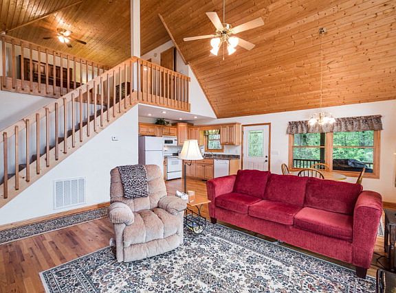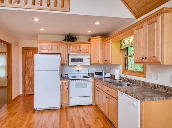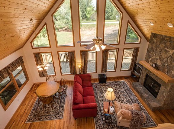 Walking On Sunshine.. Thats how youll feel in this bright and airy home with fenced yard and wraparound porchbecause rows of windows are the star of the main level here: they bathe your open-plan main floor with natural light and vistas of trees and sky. Kick back and enjoy the warm ambience of the stone fireplace, sparkling kitchen, and handy dining nook with its own view. Up the stairs is a roomy master suite with snug carpeting, private bath, and gallery overlook to the living room below. Main-floor carpeted bonus space can be a second master bedroom or guest room; its handy to kitchen, guest bath, and laundry. Secluded wooded setting, move-in ready. Just unpack and enjoy